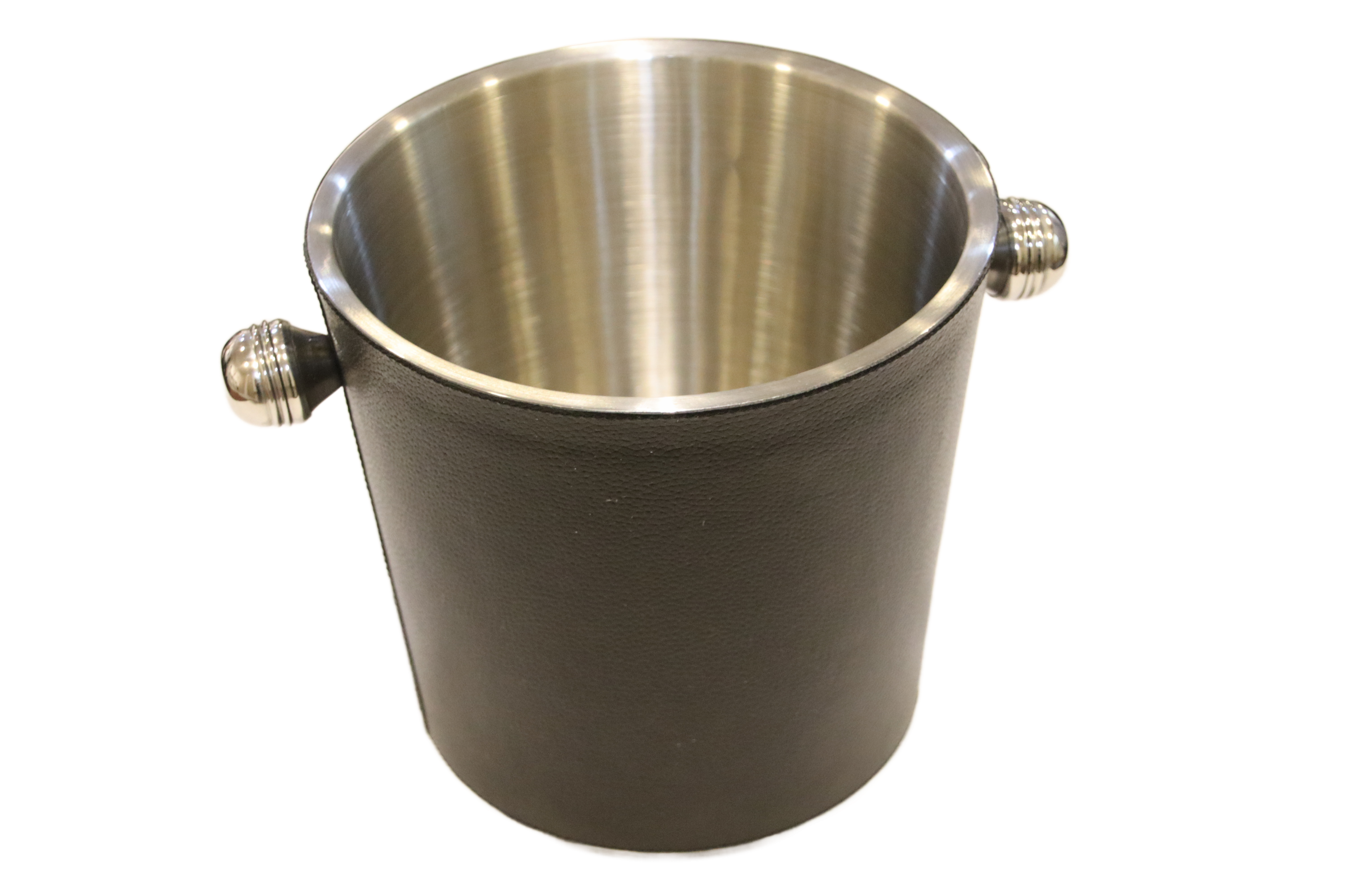 A contemporary stainless steel ice bucket wrapped in black Orva vegan leather for a refined, modern finish. It features a brushed steel interior for durability and easy cleaning, along with two decorative metal side handles for comfortable carrying. The textured exterior adds a touch of sophistication, making this ice bucket ideal for hotel rooms, suites, bars, and in-room dining presentations.