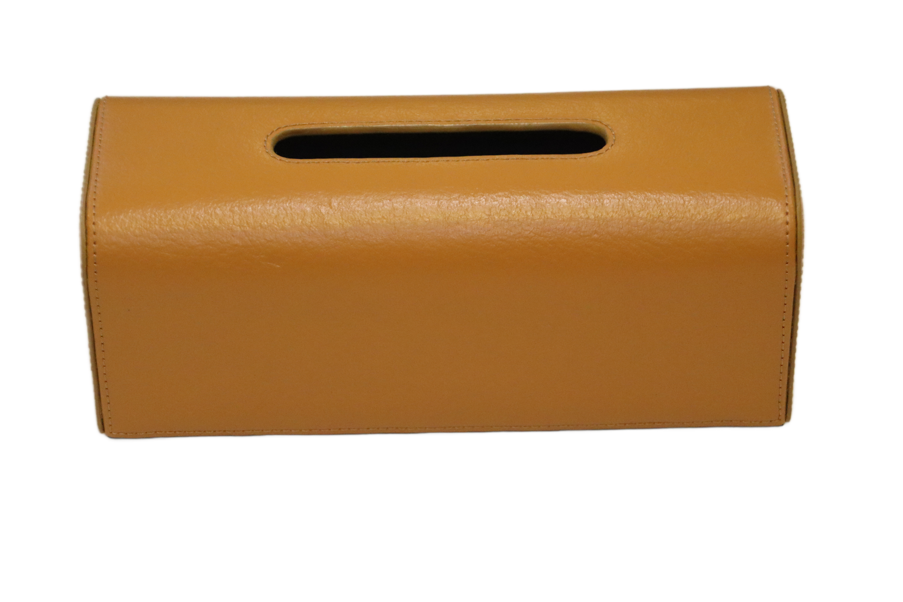 A contemporary rectangular tissue box cover crafted from smooth tan Orva vegan leather. The clean stitching and soft, rounded edges give it a refined, hotel-quality finish, while the top opening allows easy access to standard tissue packs. Designed to elevate guest rooms, bathrooms, and spa areas, this cover adds warmth, elegance, and a sustainable touch to any hospitality setting..